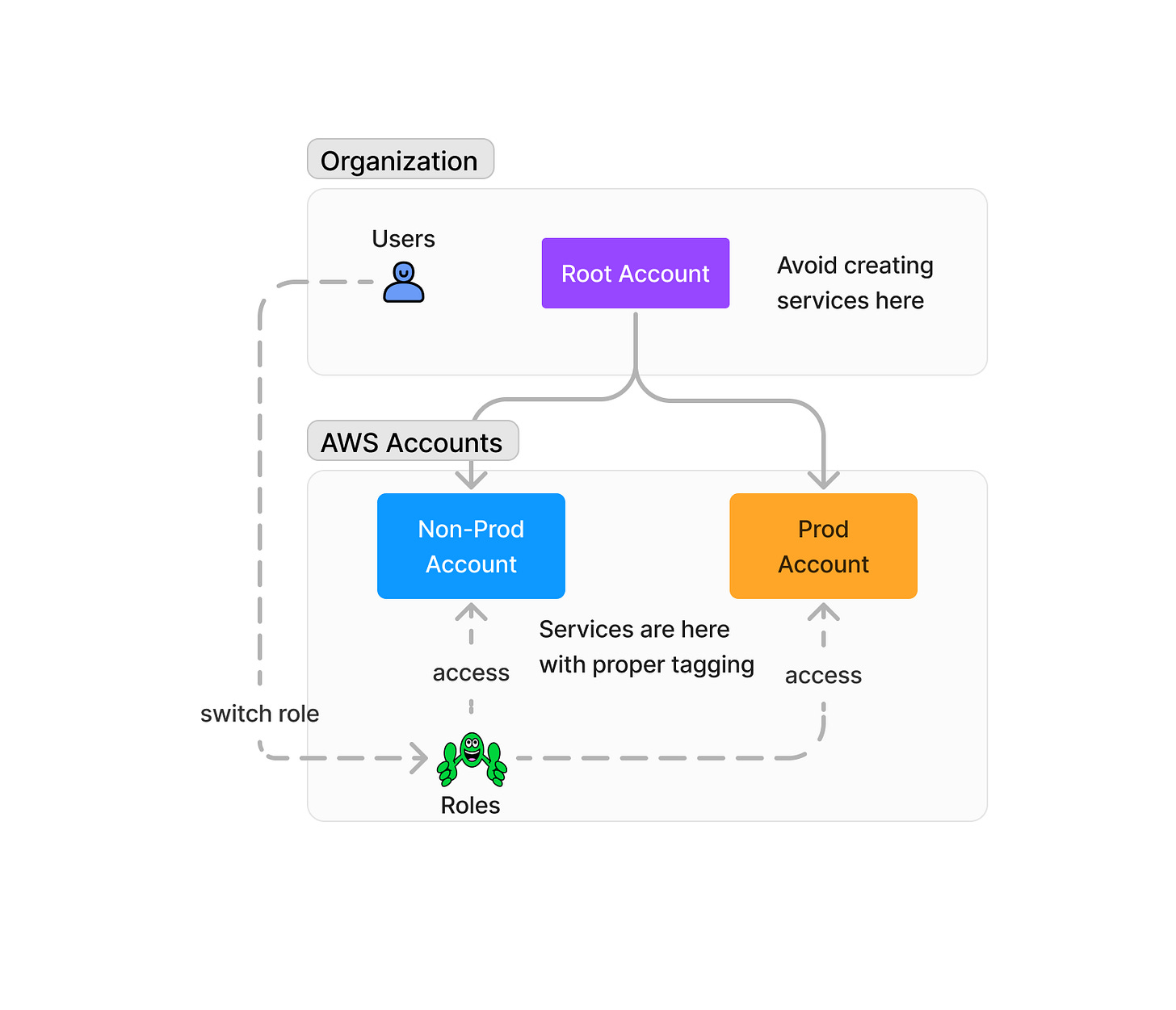 Tailor the number of accounts based on the business context, such as Non-Prod and Prod. Within these accounts, establish roles with custom policies, like the DevelopersRole role, to ensure a structured and secure environment.